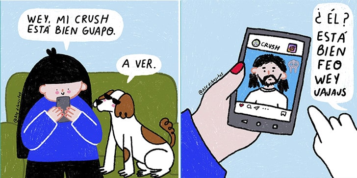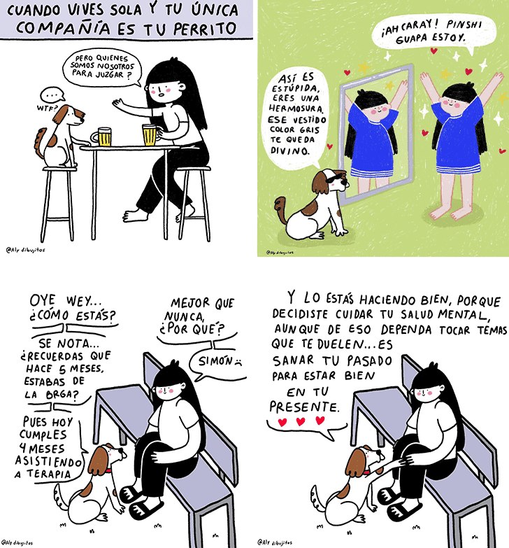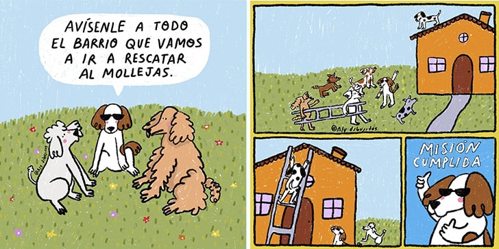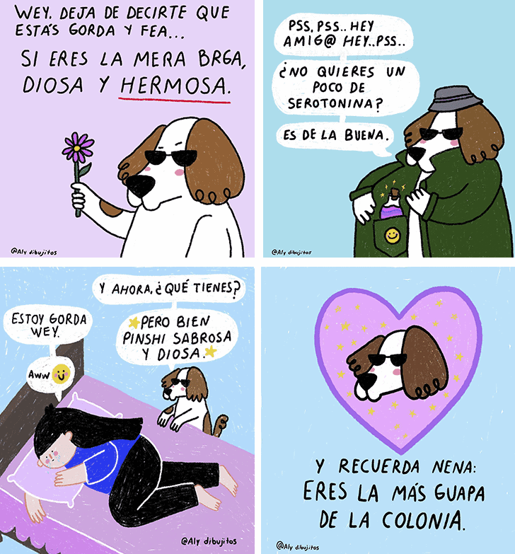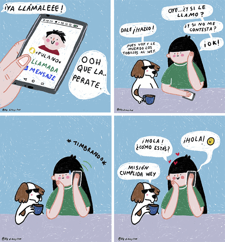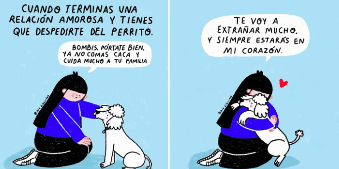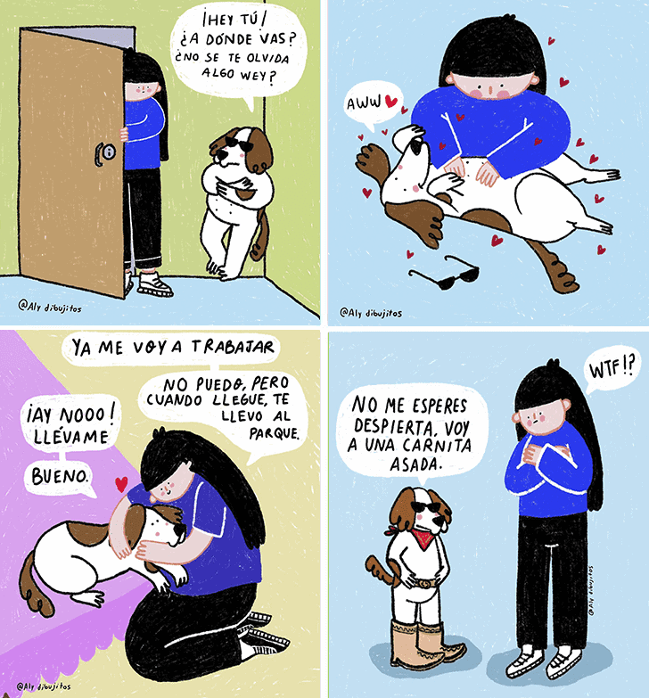 Quien ilustra a la perfección estas aventuras del día a día, es la ilustradora Aly dibujitos que dicho en sus propias palabras ilustra sus anécdotas y tragedias junto a su perro empoderado de una forma tremendamente divertida.